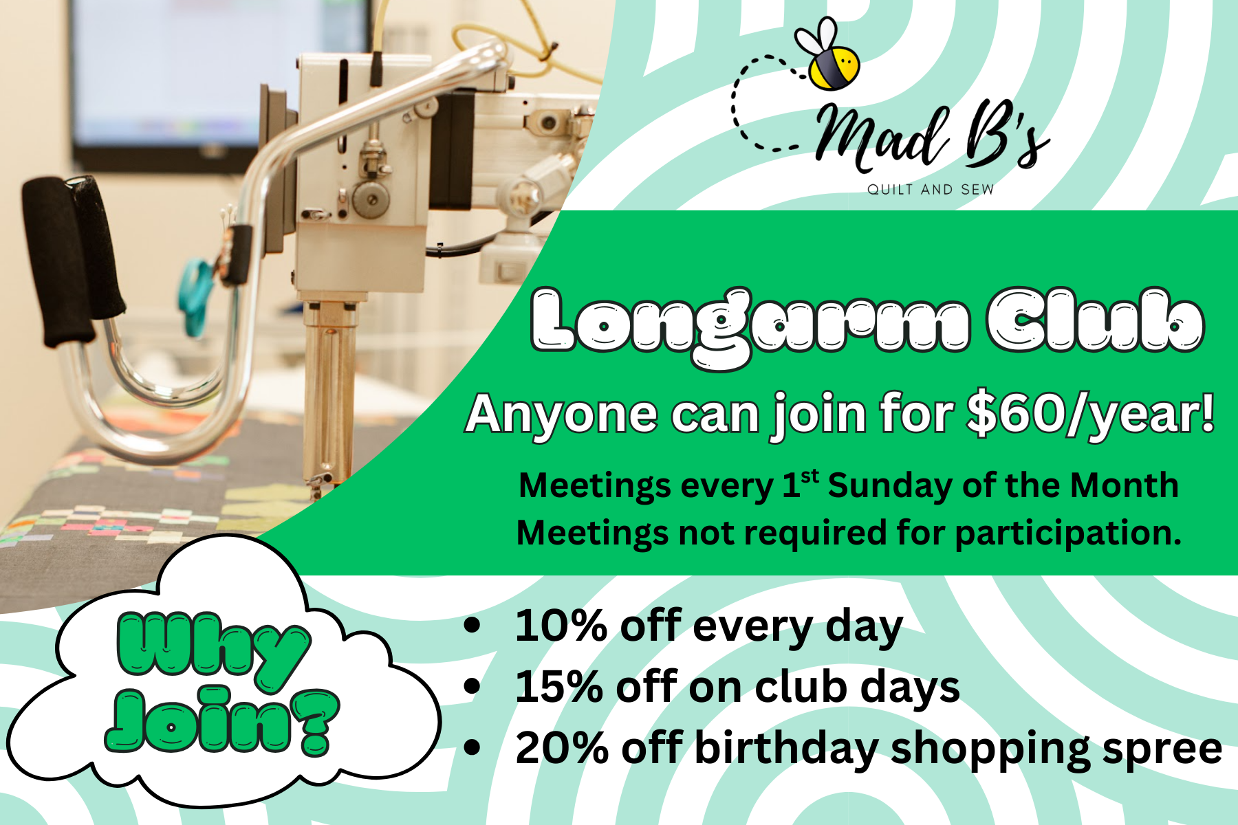 Feel free to bring items for show and tell or share any longarm quilting tips and tricks of your own. Plus feel free to ask questions and look for new quilting rulers, threads or accessories that you might need. Club members (both longarm and bee a 10) get 15% off that day!