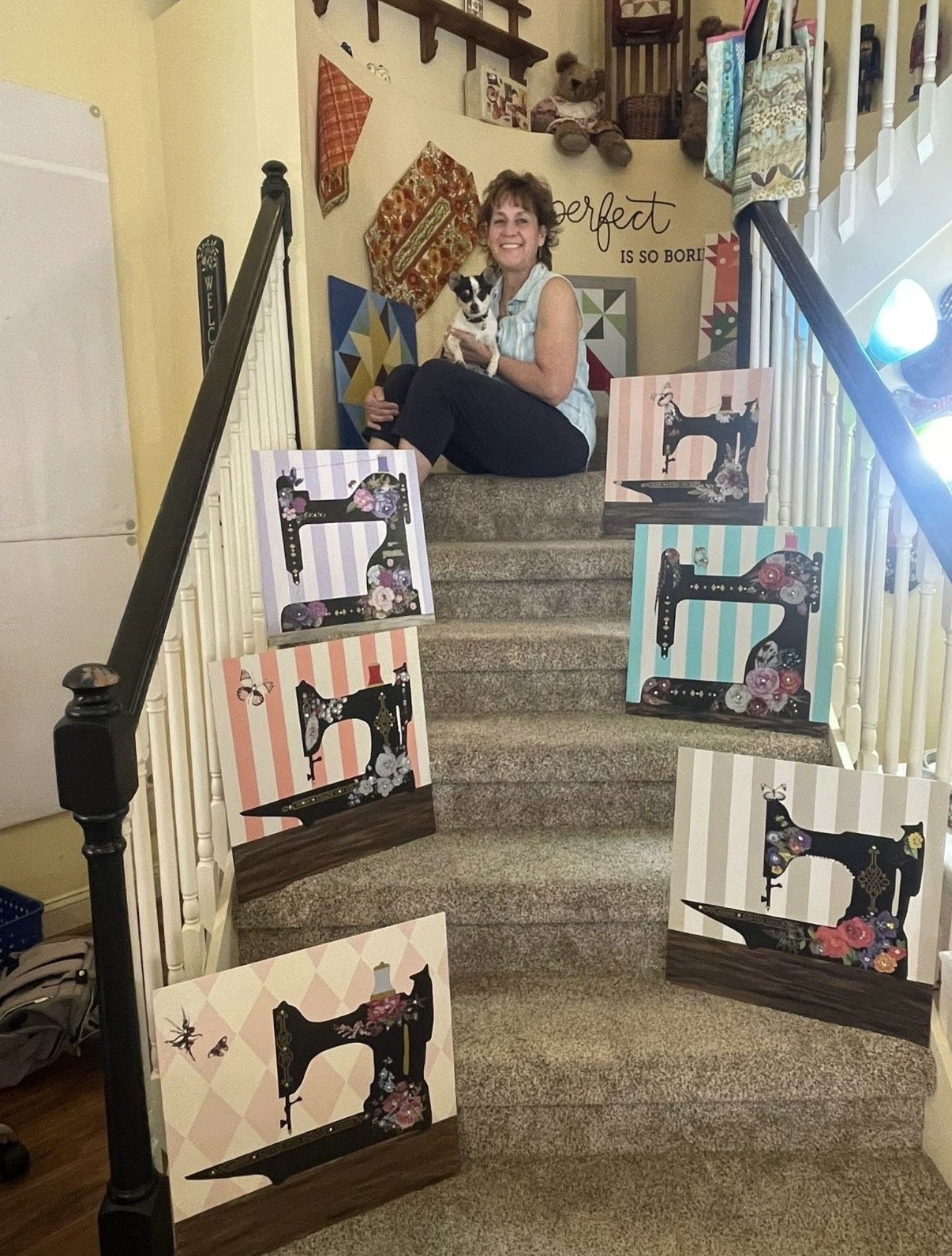 This is an exquisite indoor/undercover only, one of a kind for sure, barn quilt ART! Upon arrival your sewing machine (Modern or Featherweight) is already painted black and cured on the 18” square, Aluminum Composite board. During class time you will paint a “wood” table the machine is sitting “on” and a striped “wallpaper effect” behind the machine. Then lastly the high quality, floral decals and authentic Swarovski crystals are applied. Machine comes with 2/6mm-clear crystals and 10/5mm- clear crystals. A bird or butterfly is chosen too! And of course, any additions you would like to paint is encouraged!